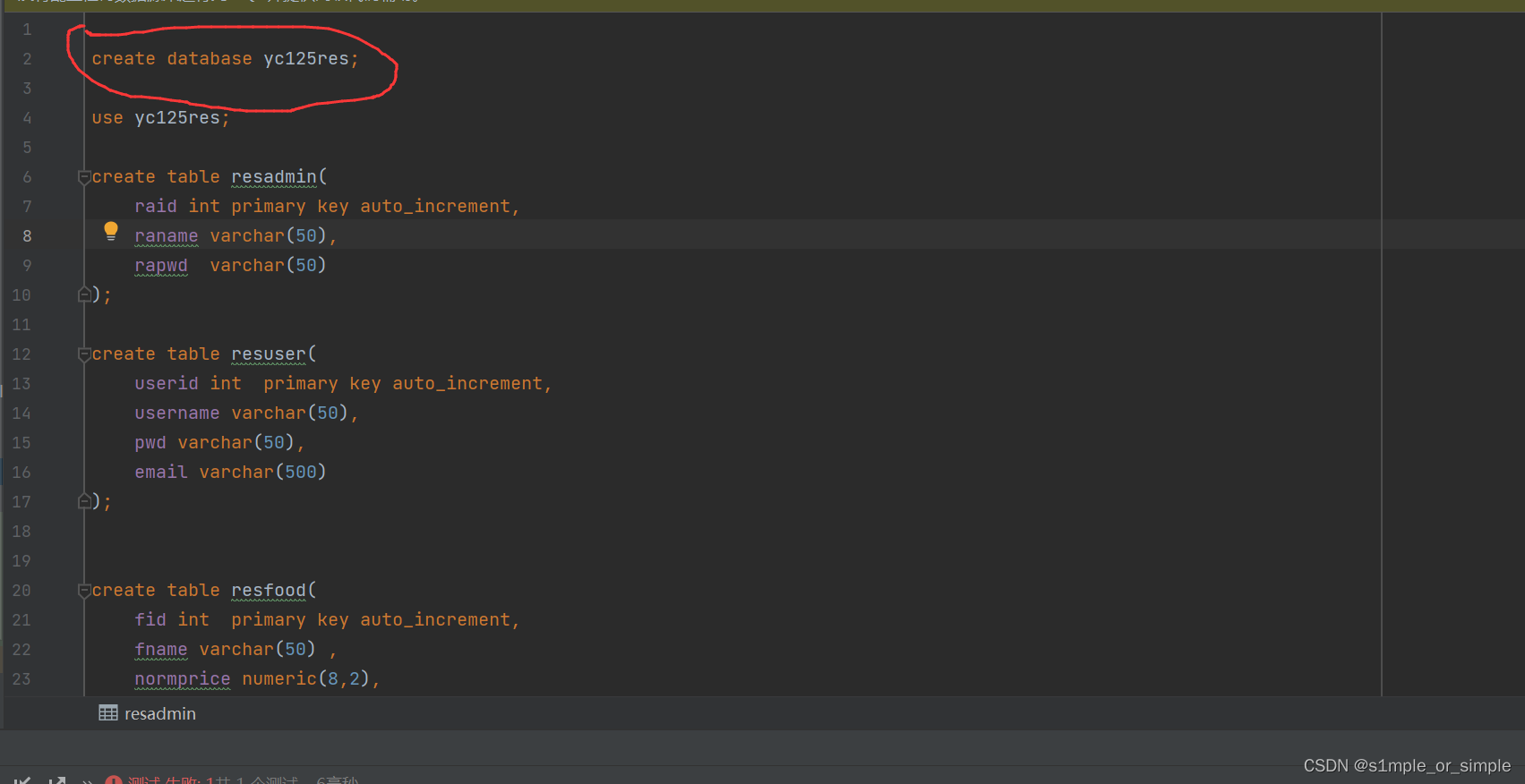 后面发现是自己的数据库中已经存在yc125res这个数据库,但编写sql语句时再次创建了一次,因为数据库重名报错