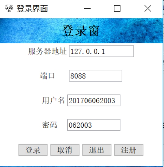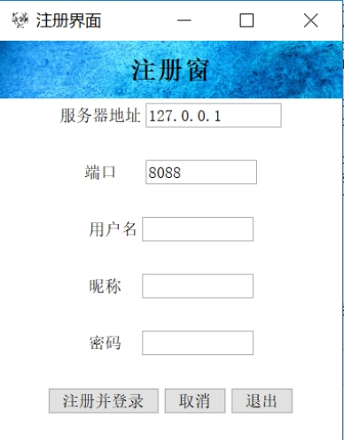 读取输入的 ip,端口,用户名,昵称,密码,并向服务器发送注册消息,服务器端判断若没有重复用户名,则返回登录窗口,并将其信息写入文件 |