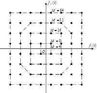 2、画出矩形 QAM 信号的空间图,虚线代表不同的 M 值的边界。