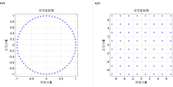 (1)观察 64PSK 和 64QAM 信号的星座图,与理论分析结果对比得出实验结论。