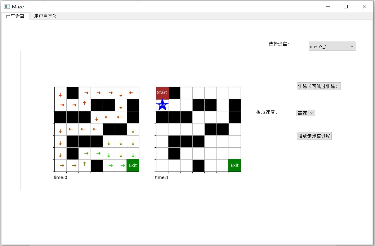 已有迷宫界面允许用户从我们定义好的几个迷宫中选择一个,进行训练并查看完整的走迷宫过程。由于我们已经训练并存储好了这些迷宫的 Q 表,用户也可以不进行训练,直接查看走迷宫过程。