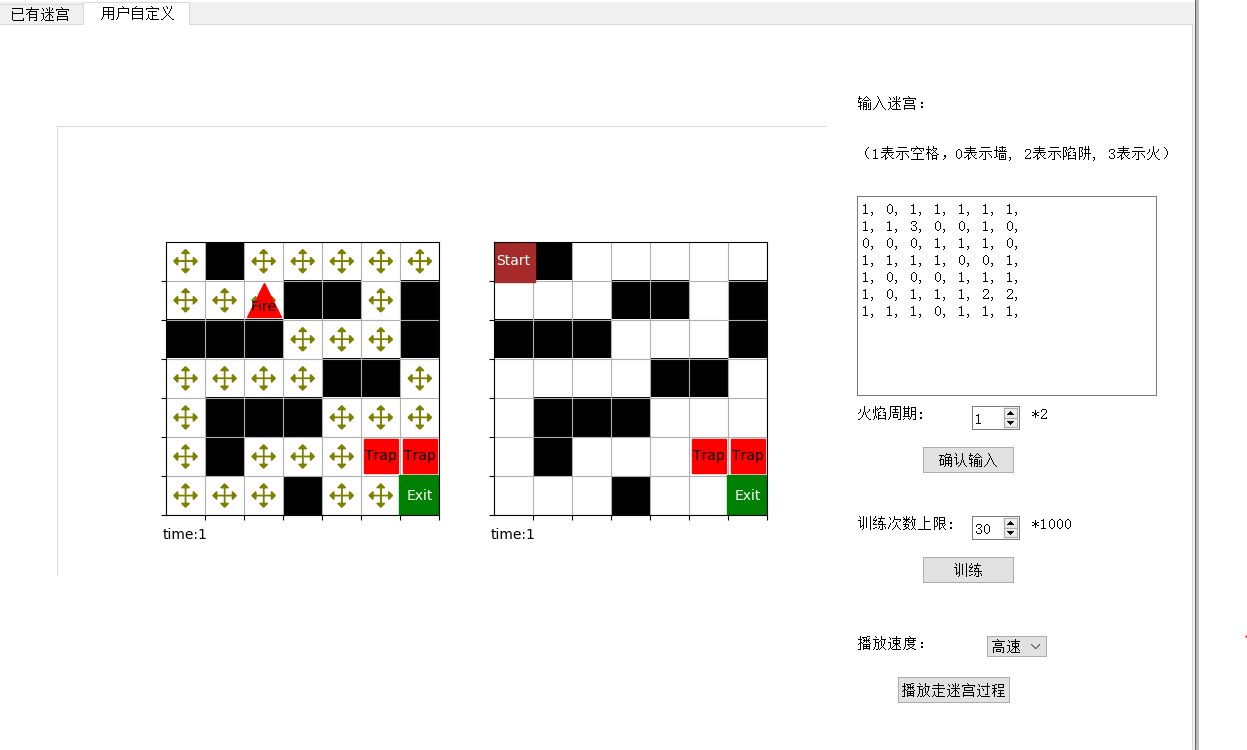 用户可以选择迷宫过程的播放速度,界面左面两个分别是可视化的 Q 表和走迷宫的路线。用户可以从 6 种迷宫中任选其一,6 种迷宫包括 2 种尺寸,3 种类型。3 种类型分别是:只有墙,有墙和陷阱,有火焰。火焰的周期默认为 2.