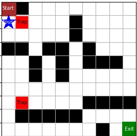 如图,红色方格代表陷阱,即老鼠夹子。与黑色方格的墙不同,老鼠可以走向陷阱,而一旦走入陷阱,游戏失败。