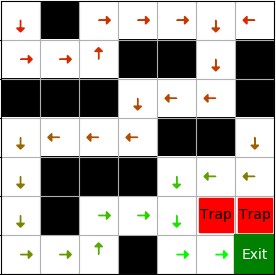下图是可视化的 Q 表,从每个状态的四个动作中选出 Q 值最大的一个,用箭头画出来,颜色表示 Q 值大小,从红到绿 Q 值越来越大。