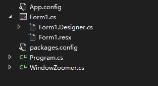 项目源码非常简洁,只有一个 WindowZoomer.cs 文件。可以将其直接复制到自己的 WinForm 项目中使用。