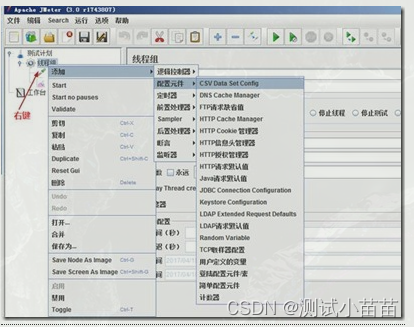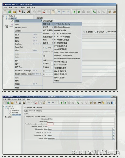 6、多组数据可增加CSVDataSetConfig(添加.csv格式的文件,并在参数值里以${x}格式写入)