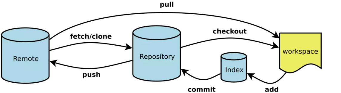 我们工作的顺序是先和远程仓库建立联系,然后克隆(clone)一份代码到自己的电脑的本地仓库,然后建立一个工作区,开始工作,修改代码。完成一个小功能后,加入(add)暂存区,当整个功能都完成的时候,提交(commit)到本地仓库。等待其他同伴开发完成他们的功能,推送(push)到远程仓库。