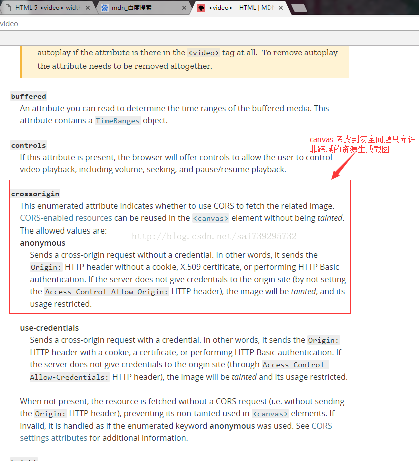 通过查看mdn 发现这里是因为请求的video 与项目不是在一个域名下导致的,canvas 基于安全的考虑不允许这样的操作,具体说名可以看MDN 上的说明:
