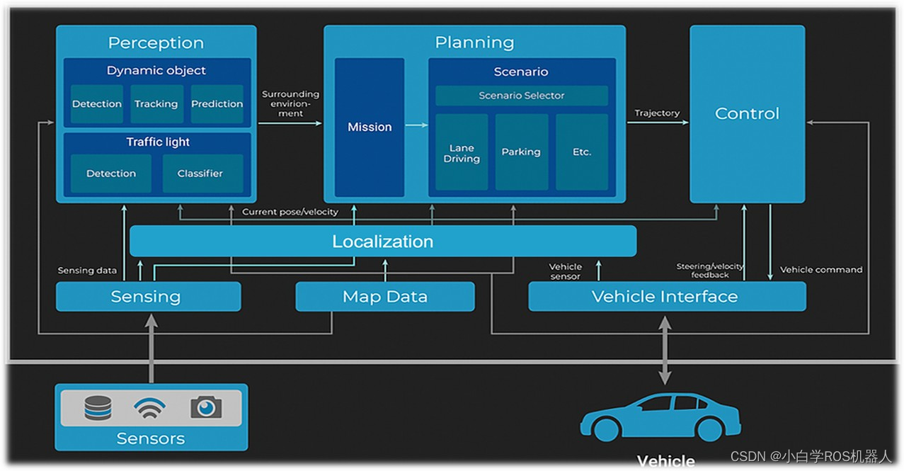 在ROS社区中,有一个著名的自动驾驶框架——Autoware,包含了自动驾驶中的感知、规划、控制等模块和实现,功能非常丰富,很多商业化的自动驾驶系统,也参考了这个框架。