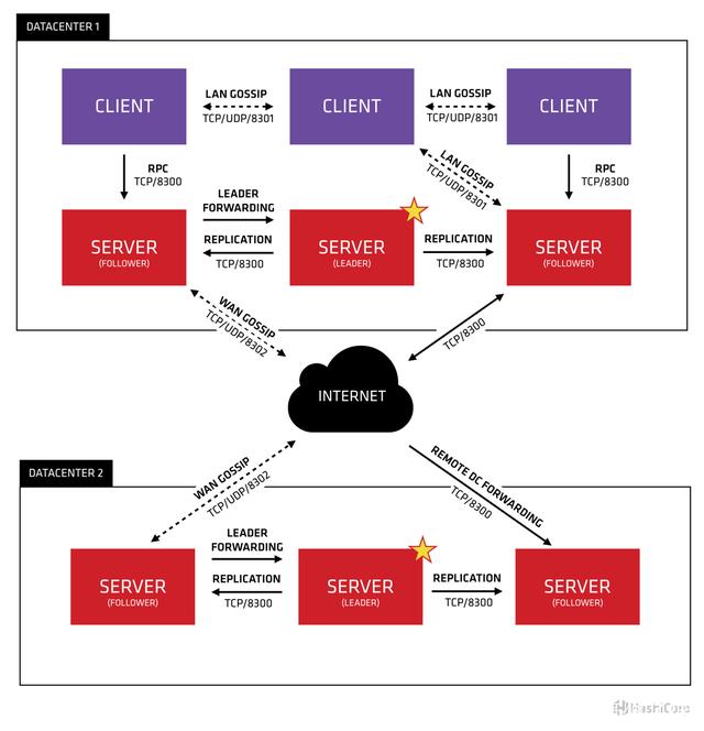 Consul提供多个数据中心的支持,基于Fabio做负载均衡,每个数据中心内,都有客户端和服务端的混合构成。预计有三到五台服务端。可以在失败和性能的可用性之间取得良好的平衡。数据中心中的所有节点都参与八卦协议。这意味着有一个八卦池,其中包含给定数据中心的所有节点。这有几个目的:首先,不需要为客户端配置服务器的地址;发现是自动完成的。其次,检测节点故障的工作不是放在服务器上,而是分布式的。这使得故障检测比天真的心跳方案更具可扩展性。第三,它被用作消息传递层,用于在诸如领导者选举等重要事件发生时进行通知。