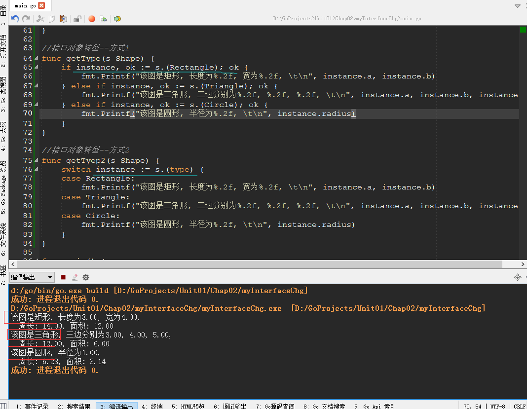 fmt.Printf("该图是三角形, 三边分别为%.2f, %.2f, %.2f, \t\n", instance.a, instance.b, instance.c)