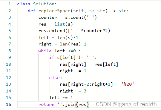 思路:双指针的思路,一个是指向原来的字符串,一个是指向新的字符串,两个指针同时移动,当旧指针指向的不是空的时候,将其值给新指针指向的位置,当旧指针指向的位置为空的时候,将新指针及其后面两个位置换乘%20并将新指针往前移动三个,旧指针往前移动一格即可。