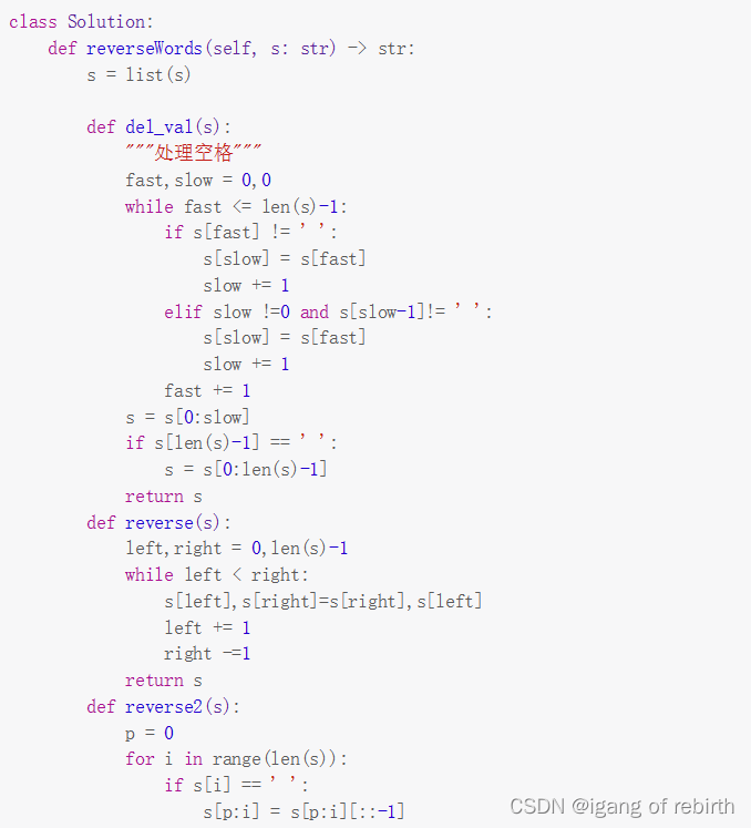 思路:这题具体的代码实现比较复杂。整体思路为首先去掉多余的空格,然后将单词反转最后将字符串整体反转。