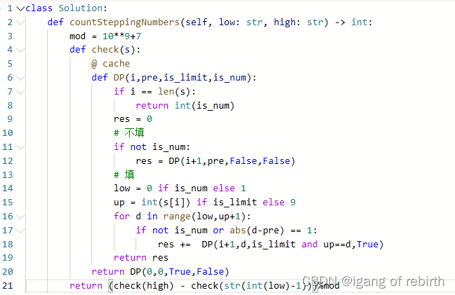 核心思想:看到题目让你求解,比如1-100之间满足某种要求的数,直接就是数位DP模板,是一个模板题,这里就不进行阐述了。需要了解的可以去看b站灵神的算法精讲里面有视频讲解。