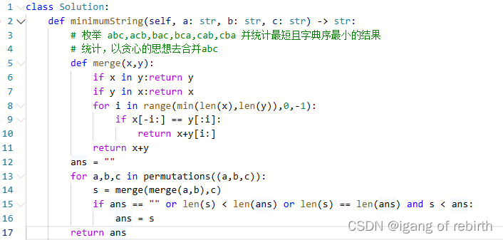 核心思想:1.枚举 abc,acb,bac,bca,cab,cba 并统计最短且字典序最小的结果;2.合并,以贪心的思想去合并abc。python枚举很简单用一个函数即可,合并利用的是前后缀的思想。