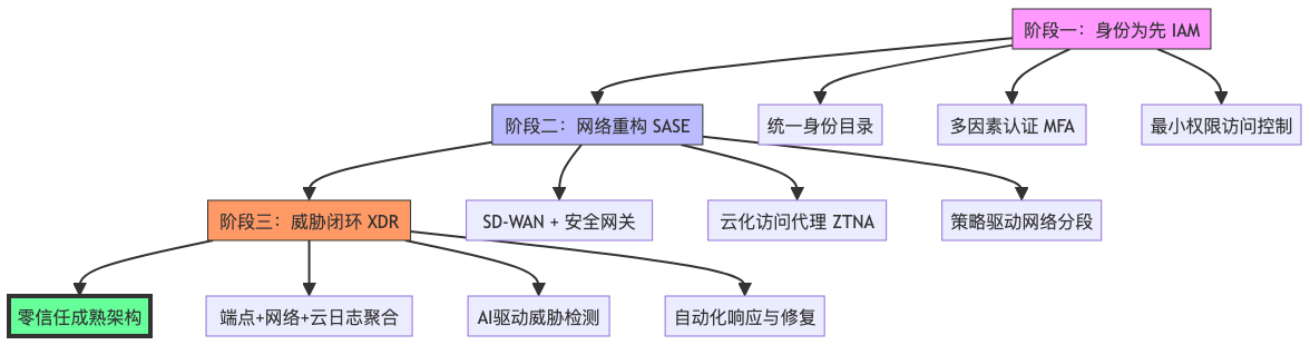 业界公认的落地路径是:以身份为基石(IAM),以网络为通道(SASE),以威胁为闭环(XDR)。三者缺一不可,协同演进。