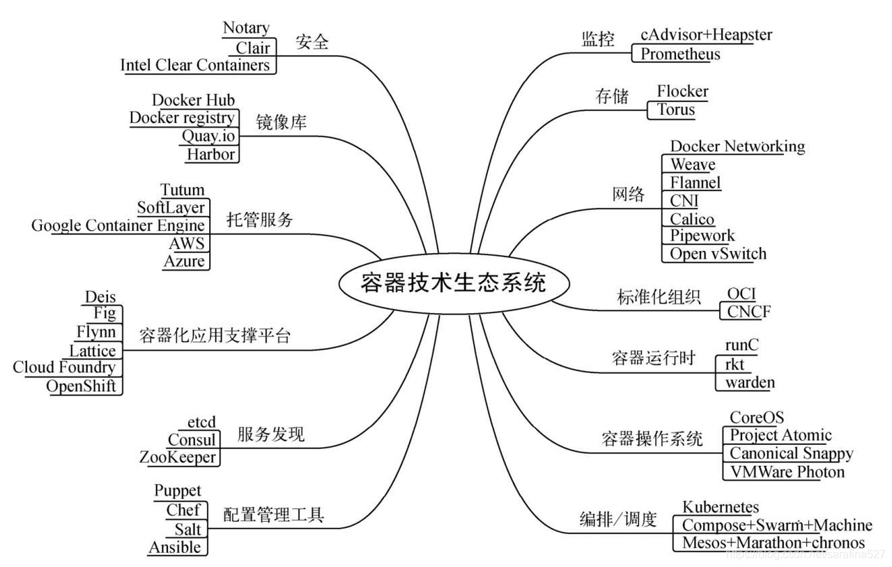 容器技术的生态系统自下而上分别覆盖了IaaS层和PaaS层所涉及的各类问题,包括资源调度、编排、部署、监控、配置管理、存储网络管理、安全、容器化应用支撑平台等。如下图,其中docker、k8s、consul、etcd等都是此处需要关注的。