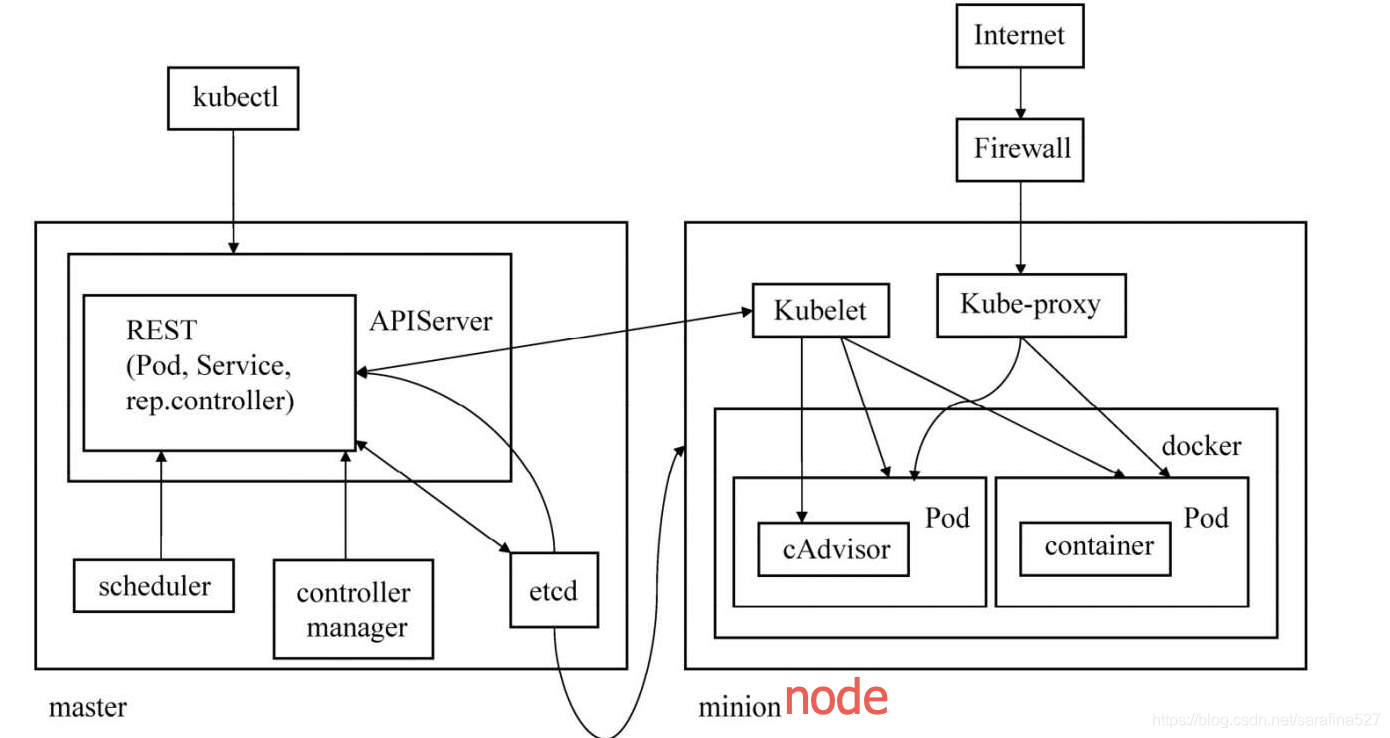 用户通过api发送指令给master,master发信号给Node,master和node的组件如下: