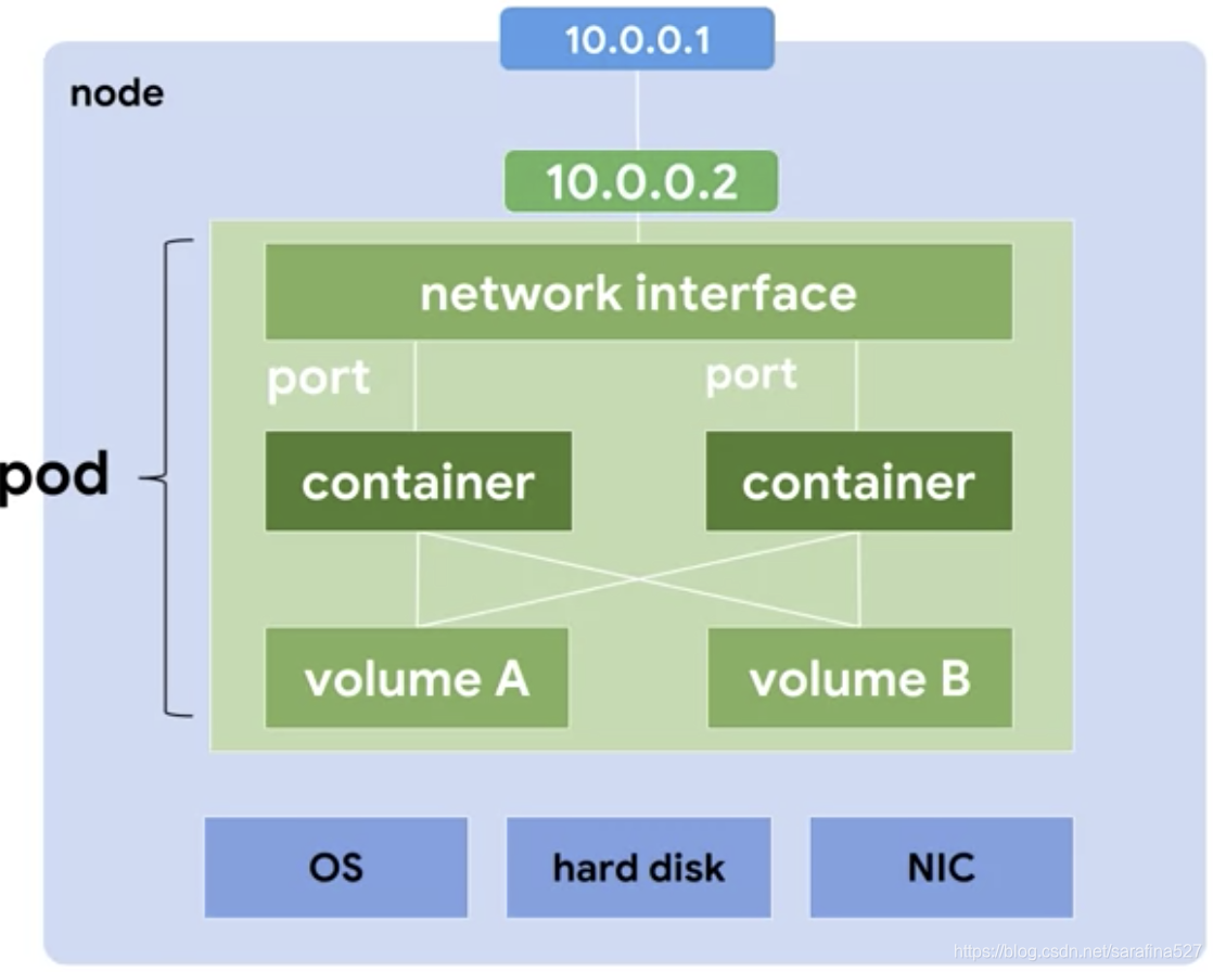 | Node | Pod | 部署、水平扩展和制作副本的最小单元。 可以有多个容器Container(Docker 容器) Pod内的所有容器共享存储和网络,pod以外是node的OS、磁盘和IP