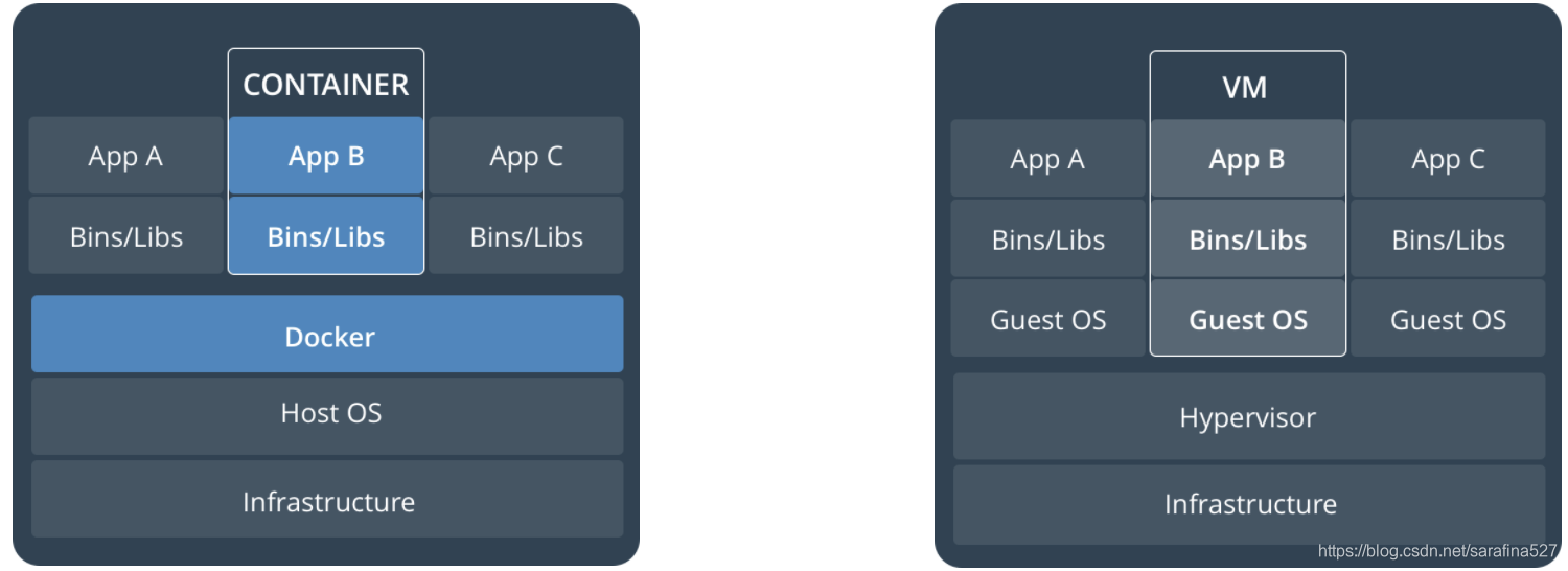 docker是虚拟化技术的升级,左图是一般的虚拟机,右图是docker,docker容器之间是共享底层操作系统的,自身不包含OS,这样就比传统虚拟机轻量级了很多,下图左是docker结构,右边是传统虚拟机。