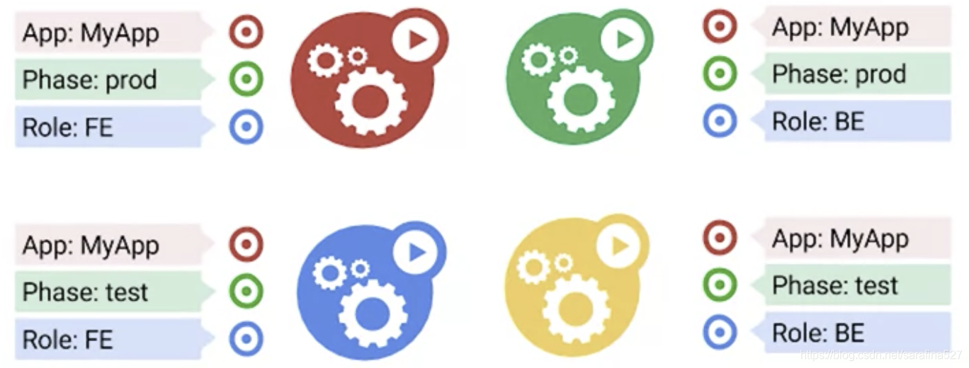 可以在yaml中指定label,如下图4个pod是同一个App,不同阶段,上面两个是生产阶段,下面两个是测试阶段,左边两个是FE前端服务,右边两个是后端服务。