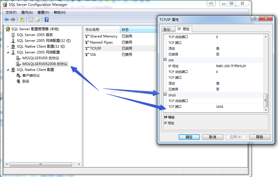 点击电脑左下方的“开始”->“Microsoft SQL Server2005”->“配置工具”->“SQL Server Configuration Manager”-> “展开网络配置” -->点击“MYSQLSERVER协议” --> 双击左侧新安装的实例数据库名 --> 展开后,再双击右侧的“TCP/IP” -->选择“IP地址”就能看到端口号了