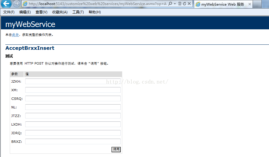 public string AcceptBrxxInsert(string JZKH, string XM, string CSRQ, string NL, string JTZZ, string LXDH, string JDRQ, string BRXZ)