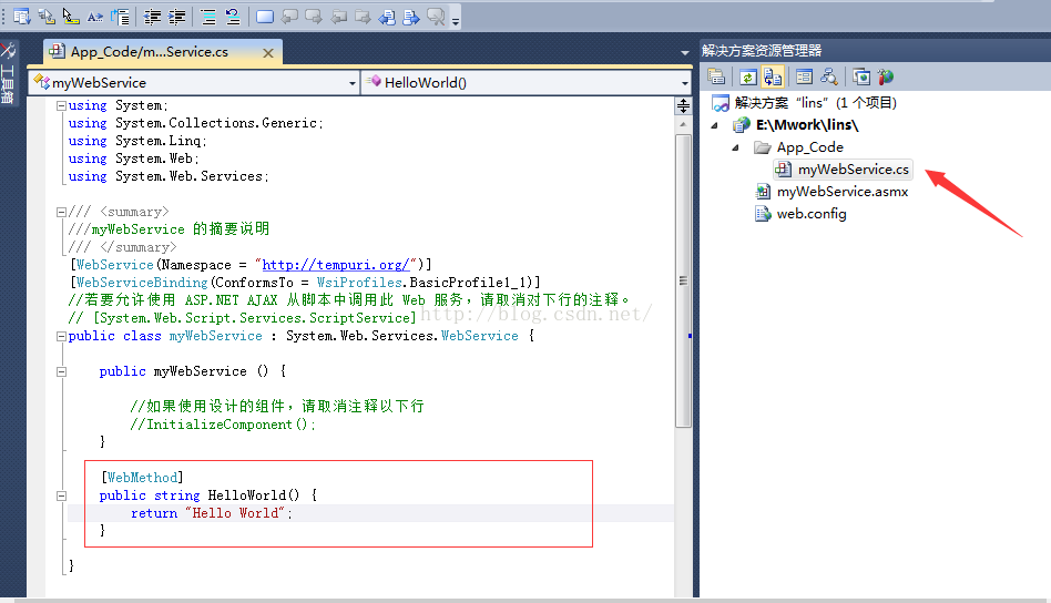选择myWebService.cs 双击,已经有存在一个HelloWord的 范例方法了。