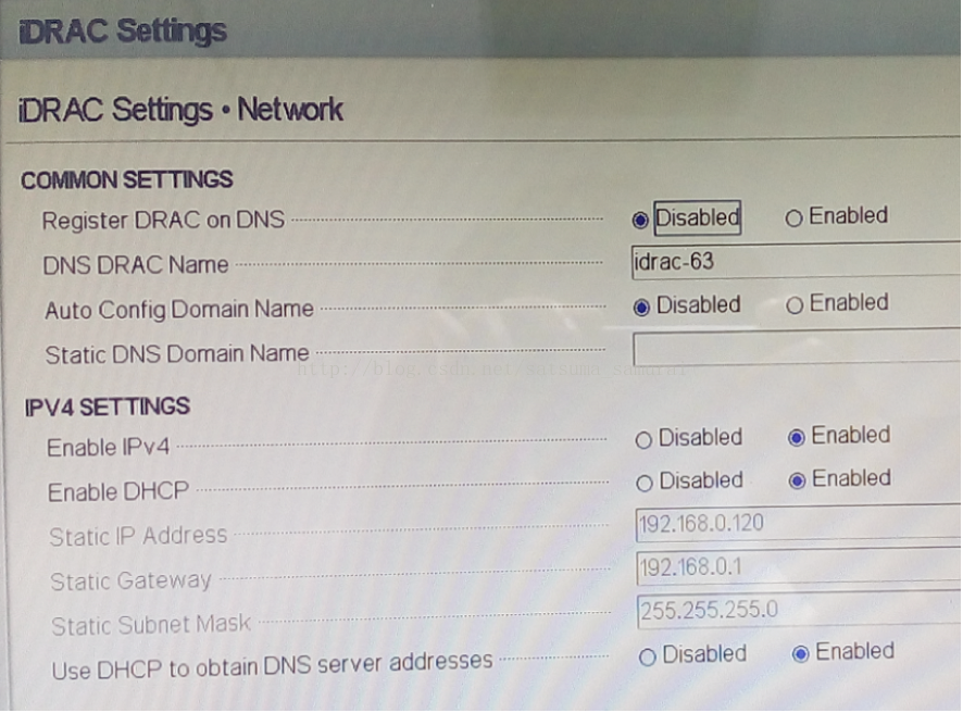 重启计算机,依照屏幕显示按F2进入SystemSetup。选择iDRACsettings – Network,需要改动的如下(现在已经不再使用DHCP):