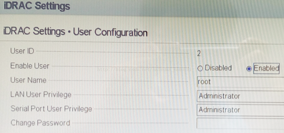 选择iDRAC settings – UserConfiguration,可以看到默认配好了一个root用户,他的默认密码是calvin,我们将在第一次使用浏览器远程登录iDRAC时修改这个密码。
