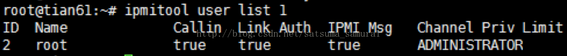 ipmitool user list 1 // 查看chanenel1的用户信息