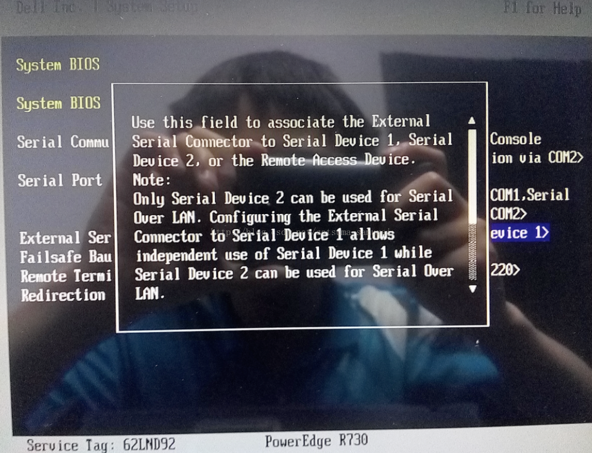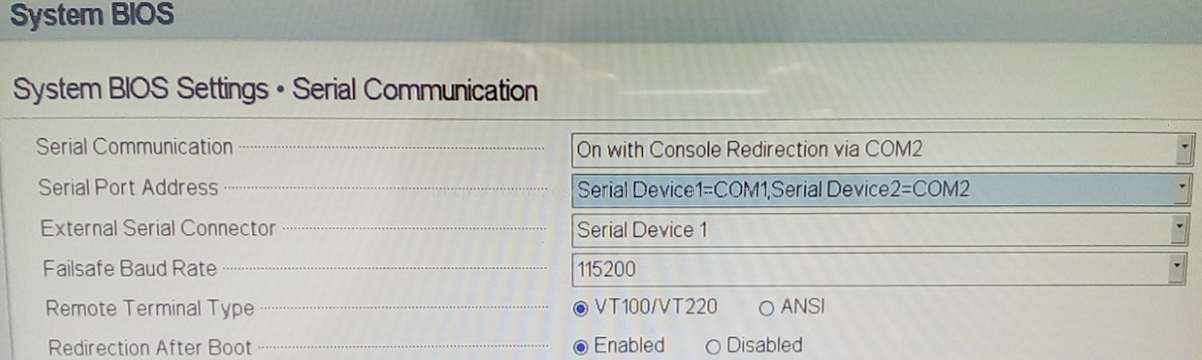 重启计算机,依照屏幕显示按F2进入SystemSetup。选择System BIOS – Serial Communication,配置成下图所示: