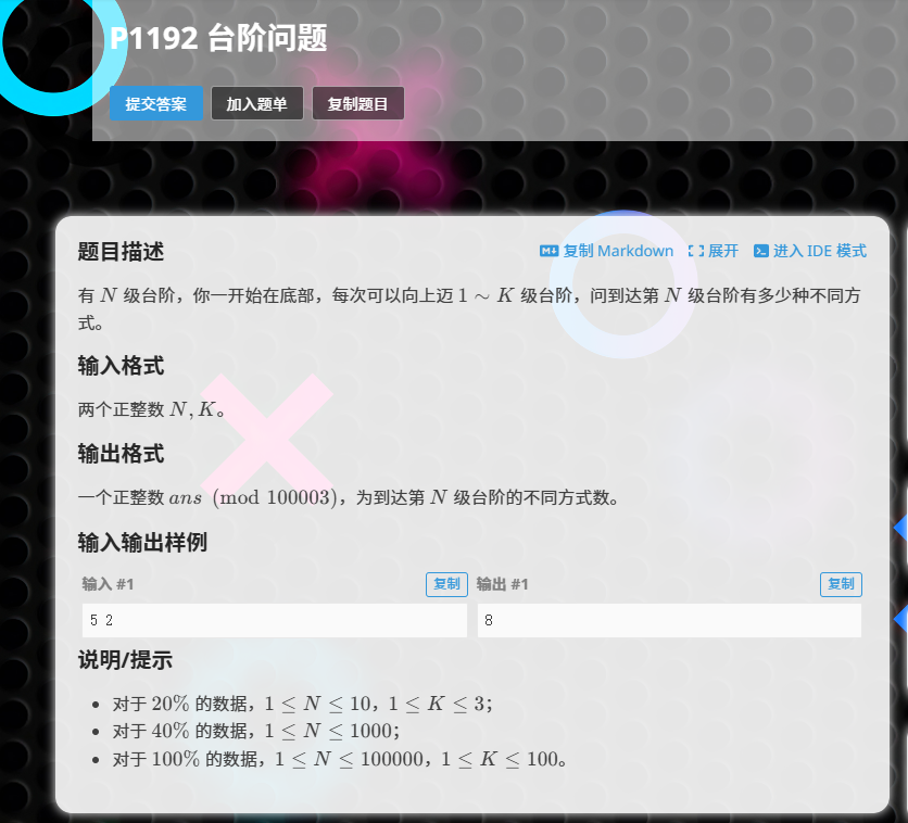 这道题是一本通 1190:上台阶的进阶版,每次能迈1~k步,所以要双层循环,a[i]+=a[i-j],还要mod 100003。