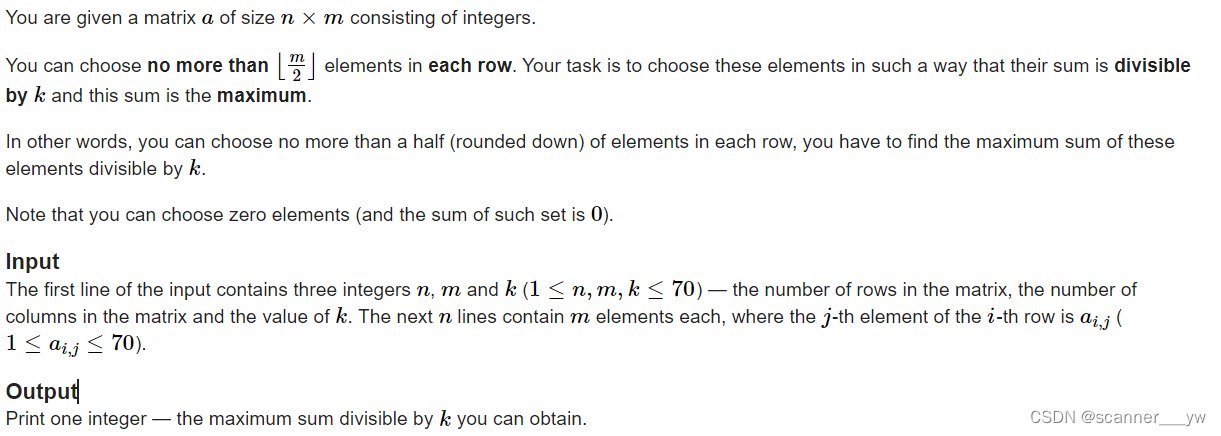 给你一个矩阵a有n*m行,每行你最多选m/2个数,问你最后选出来的数的和%k==0的最大值是多少?