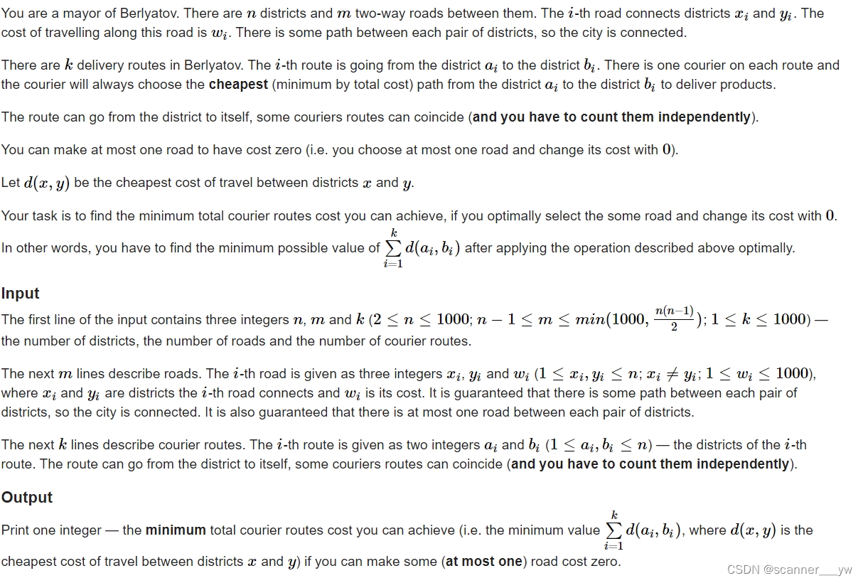 考虑对于每一个点都进行一遍djikstra,然后枚举改去除哪条边,枚举q个询问除了这条边,得到的最小价值和为多少,这里注意要分情况讨论,可能第i个询问不需要经过这条边,所以答案就是dis[st][ed],或者经过st-u,和v-ed这李答案就是dis[st][u] + dis[v][ed],或者经过st-v,ed-u,这里答案就是dis[ed][u] + dis[v][st]。