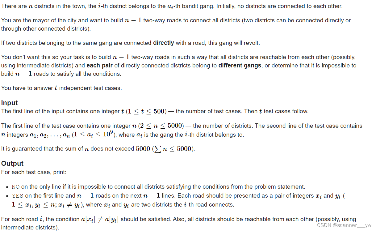 给你n个数,如果a[i] != a[j] 说明i->j可以构建一条边,问你是否可以把这个数组用n-1条边构建成一个连通块。