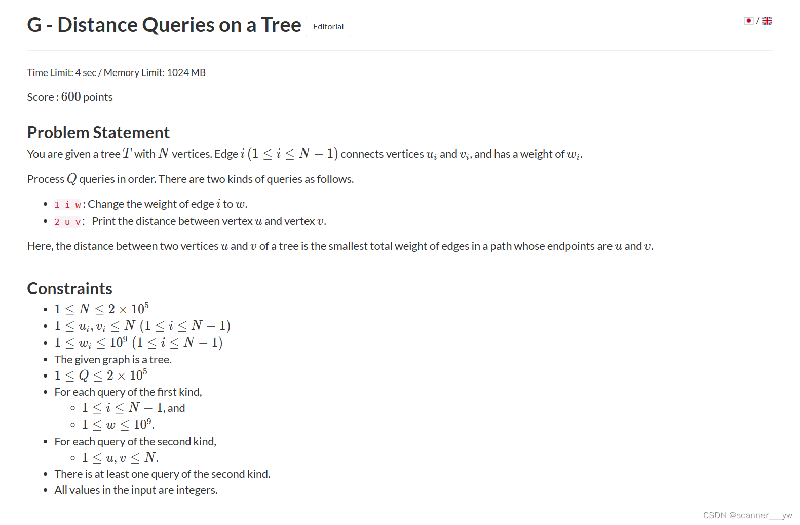 文章介绍了几个编程竞赛中的题目,包括D-Bank的区间操作模拟,E-2xNGrid的区间合并思想应用,以及F-SugarWater2的二分查找和双指针对比。此外,还讲解了G-DistanceQueriesonaTree中利用树状数组处理树上的距离查询问题。