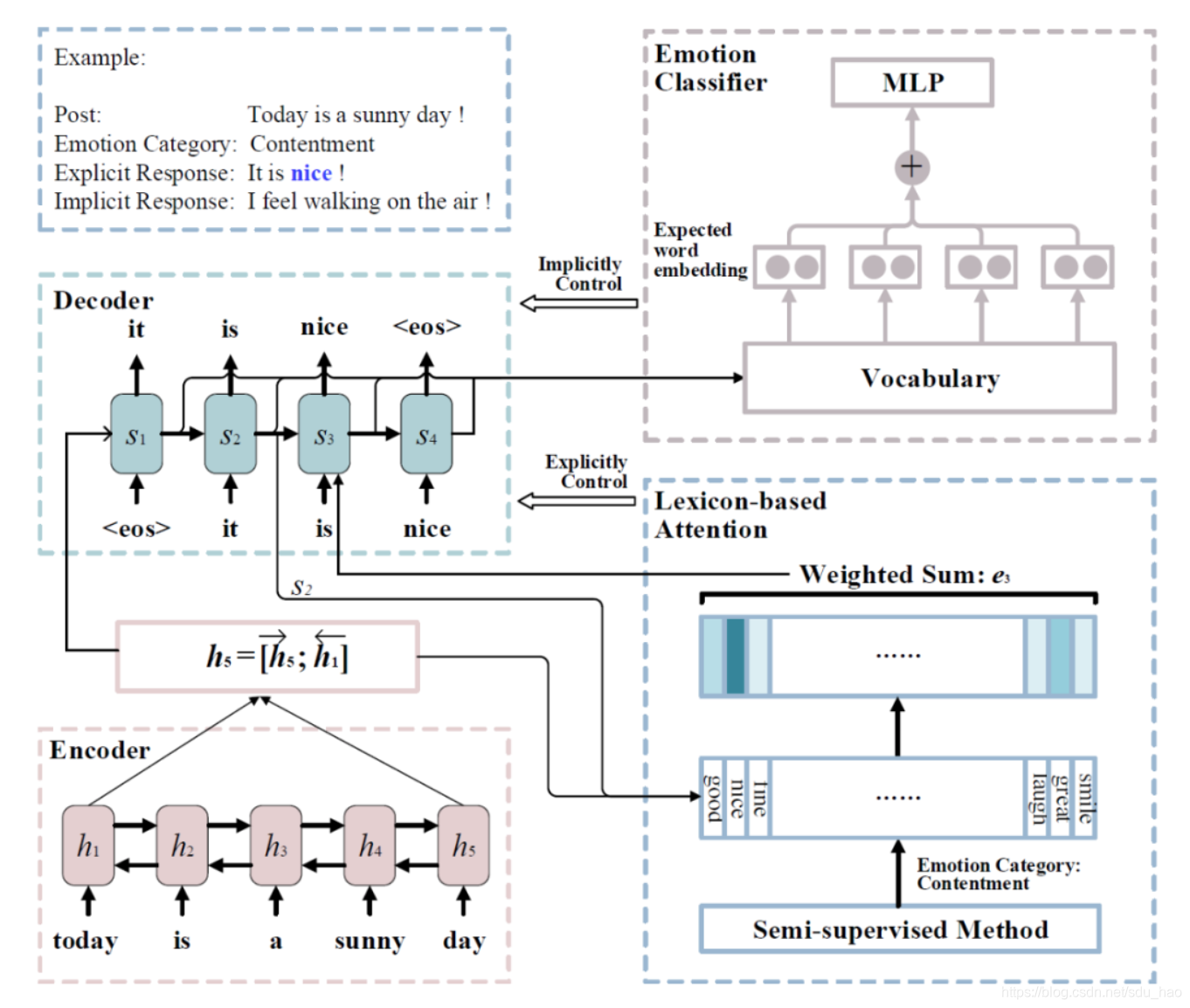 EmoDS[23]提出情感表达可以是使用强烈的情感词进行显式直接的表达,也可以是没有情感词的隐式含蓄的表达,因此在Encoder-Decoder中加入了两个模块:基于词典的Attention机制寻找期望的情感词进行显式表达,情感分类器通过增加情感表达的强度以一种隐式的方式为情感回复生成提供全局指导,其模型见下图。最终评估有嵌入得分、 BLEU、 Distinct、情感客观指标以及人工评价。