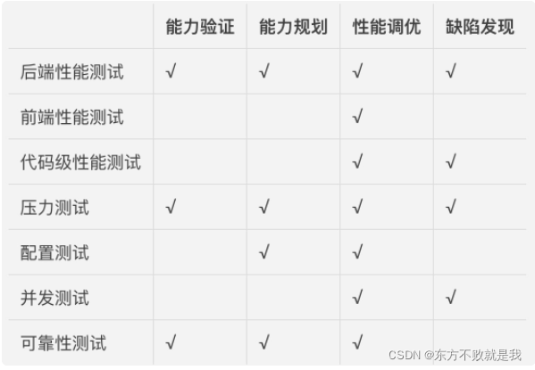 不同的性能测试方法适用于不同的应用领域去解决不同的问题,这里“不同的应用领域”主要包括能力验证、能力规划、性能调优、缺陷发现这四大方面。每个应用领域可以根据自身特点,选择合适的测试方法。
