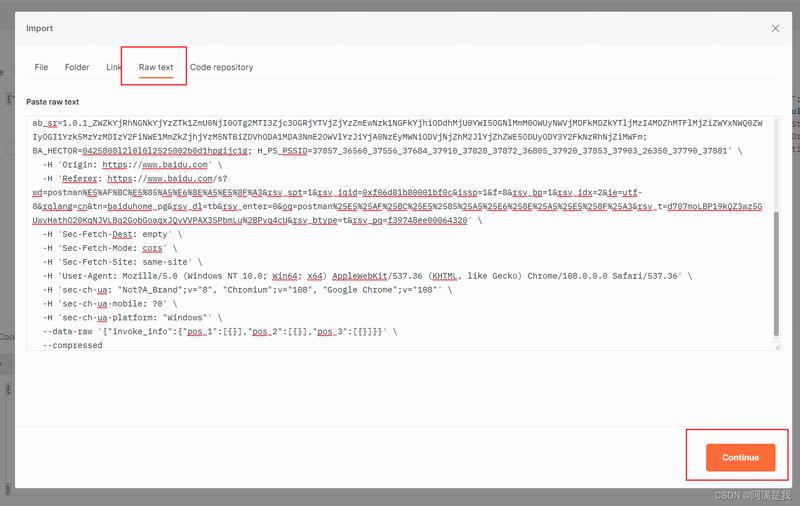 二、打开postman,点击 file -> import,选择 Raw text,将接口信息粘贴进去