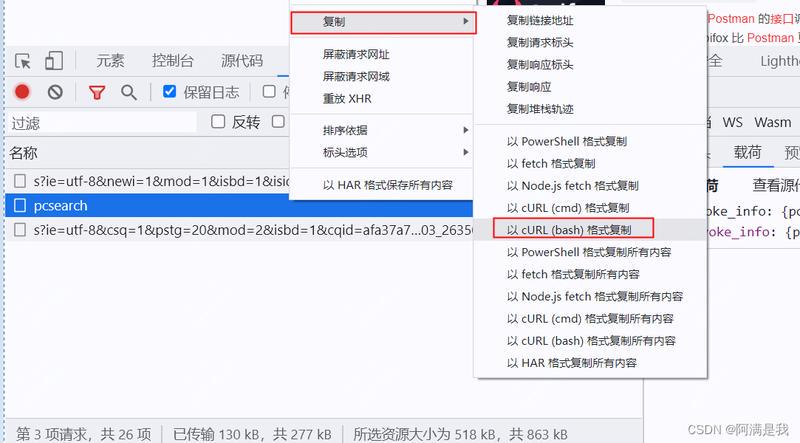 一,在浏览器中F12请求信息,找到对应的链接,右键-复制-以cURL(bash)格式复制