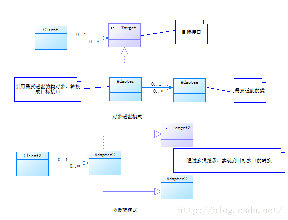 适配器模式:将一个类的接口转换成客户希望的另外一个接口,是原本不兼容二不能一起工作的那些类可以一起工作。适配器模式有两种类型:类适配模式和对象适配模式