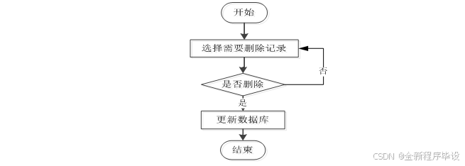最后为删除信息页面。进入该页面后,用户可以对所要删除的信息进行选择,选择好删除的内容后,会有一个“是否确认删除”的提示框,操作者可以根据自己的意愿来选择“是”或“否”。完成上述操作,系统会自动的对删除的内容进行判断,如果符合删除要求则会成功删除数据记录,并且更新数据库的内容信息;如果删除的数据记录不符合要求,则会有一个“删除失败”的提示框,操作人员需要根据提示来进行修改,修改完成后重新删除知道删除成功。删除信息流程图如图3-5所示: