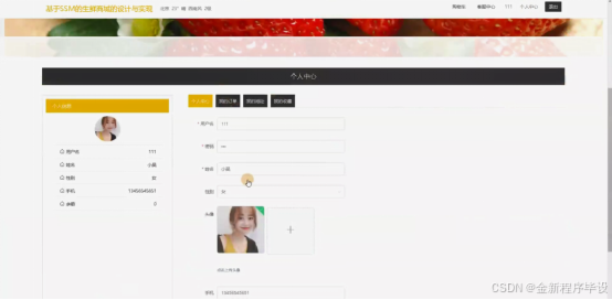 个人中心:在个人中心页面可以对个人信息、我的订单、我的地址和我的收藏进行详细操作;如图5-7所示: