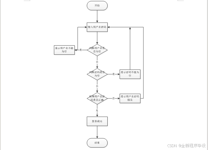 首先为系统登录页面。进入页面后,用户可进行登录和注册的操作。点击登录后,页面就会出现一个登录提示框,向用户传达信息:要进行用户名和密码的输入,完成后才可以进行下一步的操作。用户输入完成后,系统会将输入的信息提交给后台,与数据库中的信息记录进行比较判断。判断比较内容主要分为三个方面:从用户名是否为空、输入的密码是否为空、用户名和密码是否匹配三方面进行判断。只有上述三个条件同时满足,数据库中的信息匹配正确,才视为登陆成功,方可完成后续的操作。若以上三种情况有一条不满足,则会提示该次登录错误,就需要进行重新登录。系统登录流程图如图3-3所示: