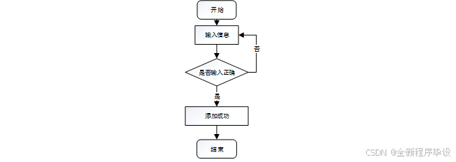 然后是添加信息的页面。进入该页面后,页面会出现一个提示框,示意操作者可以进行信息的添加,从而进行下一步的操作。用户输入想要添加的信息后提交,系统会对输入的内容进行检测。如果检测后输入的信息正确,则会出现“添加成功”的提示框,从而可以进行下一步操作;如果系统检测后检测到想要添加的信息不符合规范要求,则会提示报错,需要进行修改后重新添加。添加信息流程图如图3-4所示: