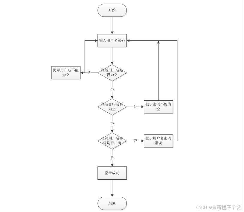 首先为系统登录页面。进入页面后,用户可进行登录和注册的操作。点击登录后,页面就会出现一个登录提示框,向用户传达信息:要进行用户名和密码的输入,完成后才可以进行下一步的操作。用户输入完成后,系统会将输入的信息提交给后台,与数据库中的信息记录进行比较判断。判断比较内容主要分为三个方面:从用户名是否为空、输入的密码是否为空、用户名和密码是否匹配三方面进行判断。只有上述三个条件同时满足,数据库中的信息匹配正确,才视为登陆成功,方可完成后续的操作。若以上三种情况有一条不满足,则会提示该次登录错误,就需要进行重新登录。系统登录流程图如图3-1所示: