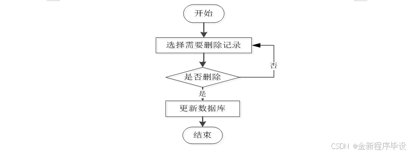 最后为删除信息页面。进入该页面后,用户可以对所要删除的信息进行选择,选择好删除的内容后,会有一个“是否确认删除”的提示框,操作者可以根据自己的意愿来选择“是”或“否”。完成上述操作,系统会自动的对删除的内容进行判断,如果符合删除要求则会成功删除数据记录,并且更新数据库的内容信息;如果删除的数据记录不符合要求,则会有一个“删除失败”的提示框,操作人员需要根据提示来进行修改,修改完成后重新删除知道删除成功。删除信息流程图如图3-3所示: