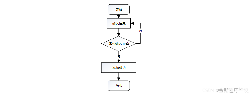 然后是添加信息的页面。进入该页面后,页面会出现一个提示框,示意操作者可以进行信息的添加,从而进行下一步的操作。用户输入想要添加的信息后提交,系统会对输入的内容进行检测。如果检测后输入的信息正确,则会出现“添加成功”的提示框,从而可以进行下一步操作;如果系统检测后检测到想要添加的信息不符合规范要求,则会提示报错,需要进行修改后重新添加。添加信息流程图如图3-2所示: