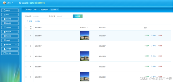 车站信息在视图层(view层)进行交互,比如点击“新增”按钮或填写车站信息需求信息表单。这些车站信息动作被视图层捕获并作为请求发送给相应的控制器层(control1er层)。控制器接收到这些请求后,调用服务层(service层)以执行相关的业务逻辑,例如验证输入数据的有效性和与数据库的交互。服务层处理完这些逻辑后,进一步与数据访问对象层(DAO层)交互,后者负责具体的数据操作如查询、新增、更新或删除车站信息,并将操作结果返回给控制器。最终,控制器根据这些结果更新视图层,以便车站信息可以看到最新的信息或相应的操作反馈。在车站信息页面的输入栏中输入车站名称、车站位置进行查询,可以查看到车站信息详细信息,并根据需要进行新增或者删除等操作如图5-11所示: